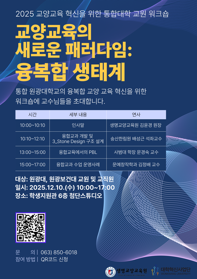 교양교육의 새로운 패러다임: 융복합 생태계 안녕하세요, 생명교양교육원입니다. 통합 원광대학교의 융복합 교양 교육 혁신을 위한 워크숍에 교수님들을 초대합니다. 1. 대상: 원광대, 원광보건대 교원 및...