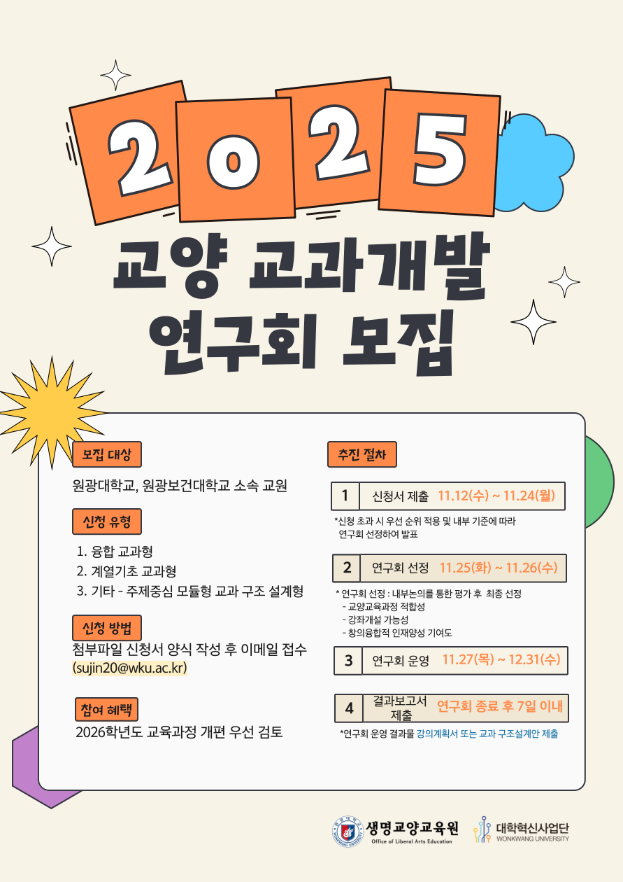 안녕하세요, 생명교양교육원입니다. 생명산업분야 전인적 인재양성 및 창의융합적 인재양성의 기틀을 마련하기 위해 교원의 교양 교과개발을 지원하고 이를 교양교육과정에 활용하기 위한 목적을 가진 교양교과개발 연구회를 모집합니다! 원광대학교, 원광보건대학교 소속 교원이시라면 누구나 신청 가능합니다.:)
